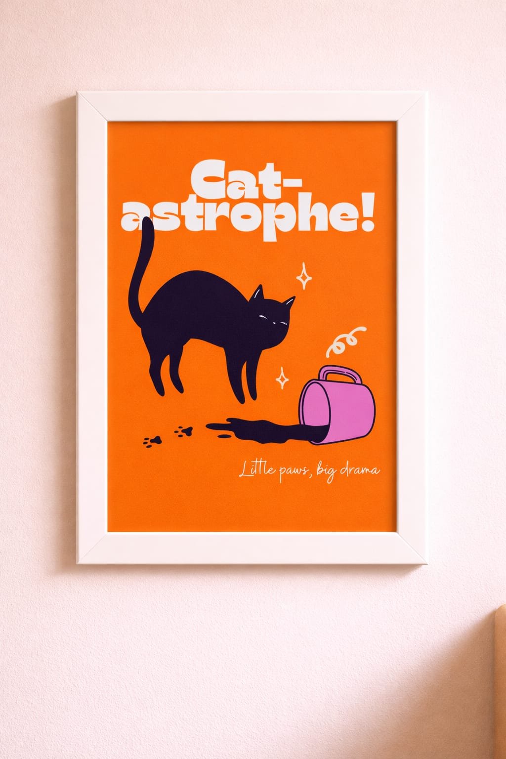 Jer svako ko ima mačku zna — ovo nije slučajnost. Živopisni narandžasti poster sa crnom mačkom i natpisom Little paws big drama. ✦ Format: A4 ✦ Beli drveni ram uključen ✦ Idealan poklon za ljubitelje mačaka.