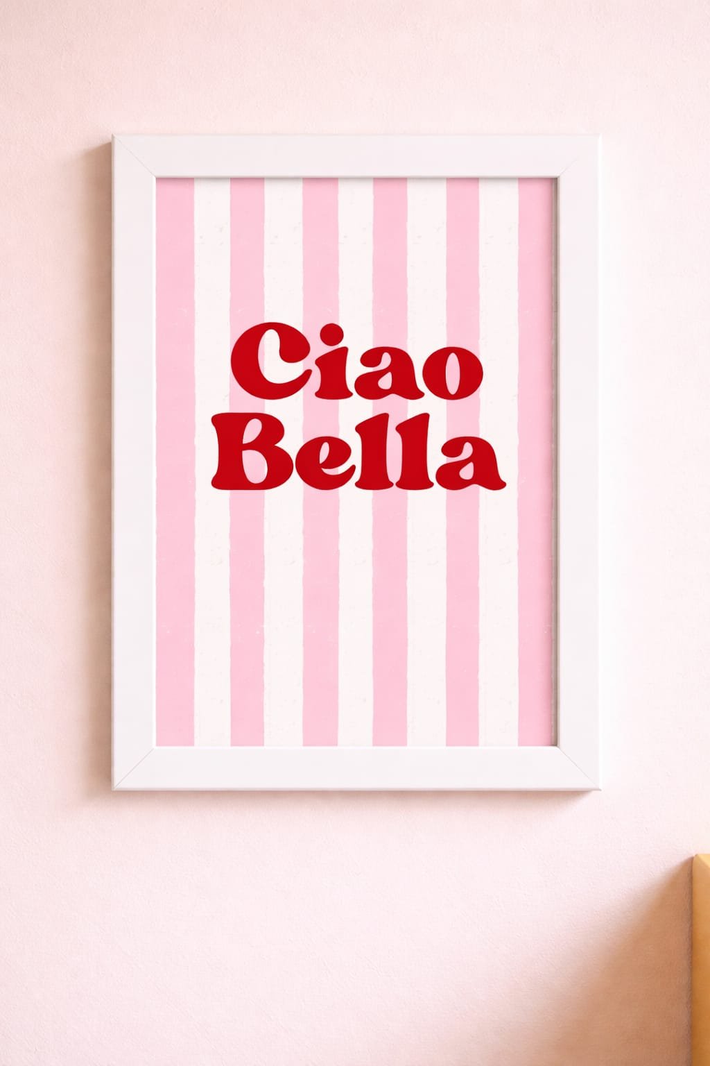 Roze prugasti poster sa crvenim retro natpisom Ciao Bella — estetski i pun italijanskog šarma. Sa belim ramom!