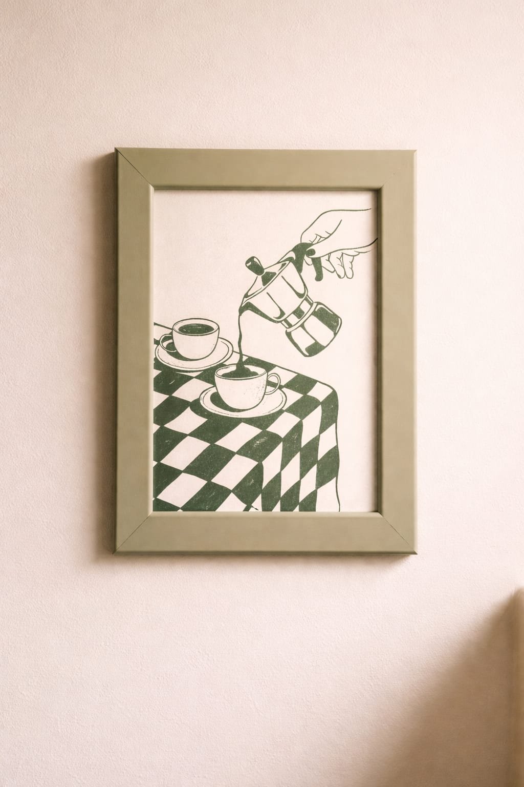 Za one čiji dan počinje kafom. Nostalgična ilustracija u zelenim tonovima sa mokha aparatom i šoljicama na karirastom stoljnjaku. ✦ Format: A4 ✦ Zeleni drveni ram uključen ✦ Idealan za kuhinju.
