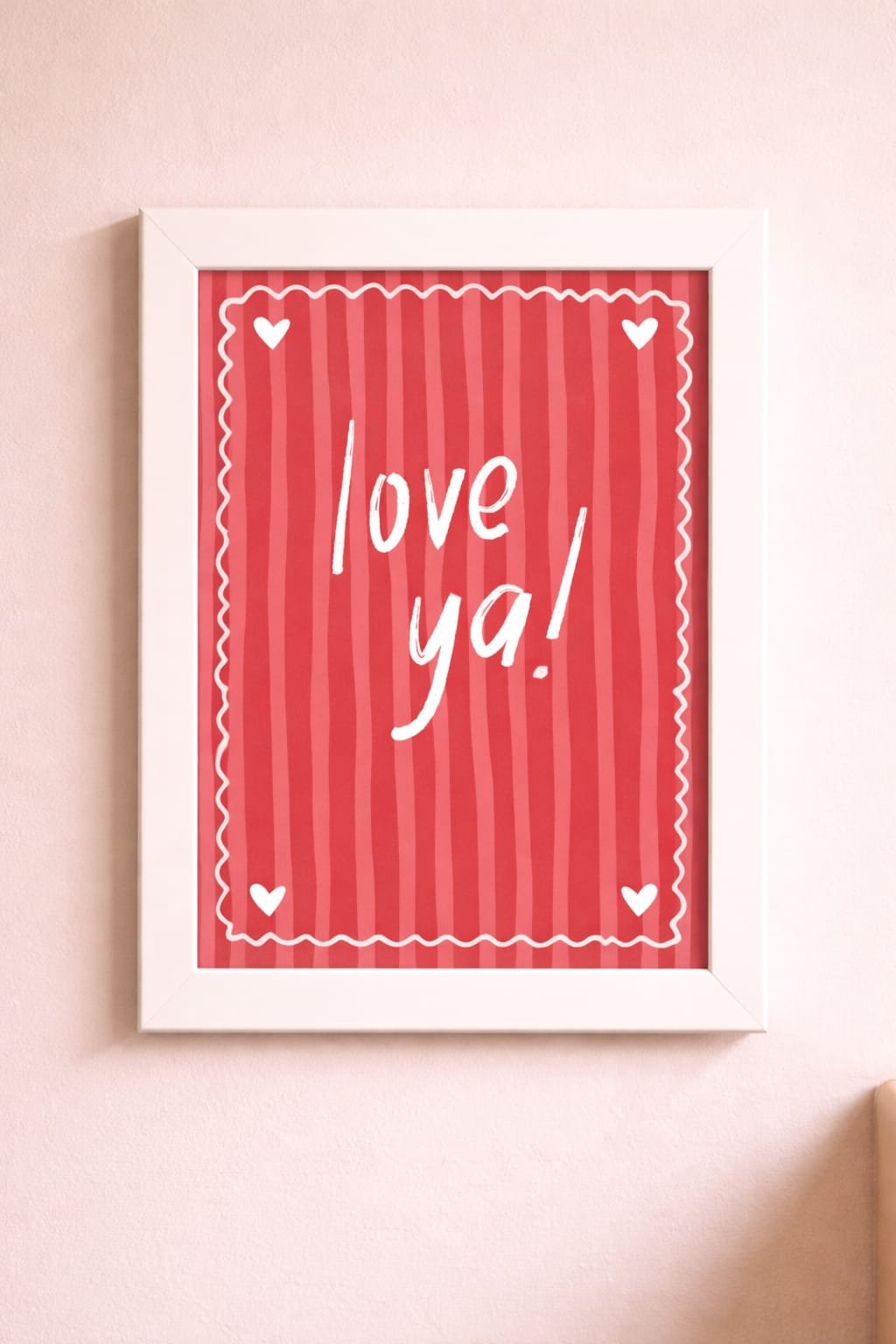 Preslatki roze-crveni poster sa srcima i natpisom Love Ya! — živopisan poklon za sve voljene osobe. Sa belim ramom!