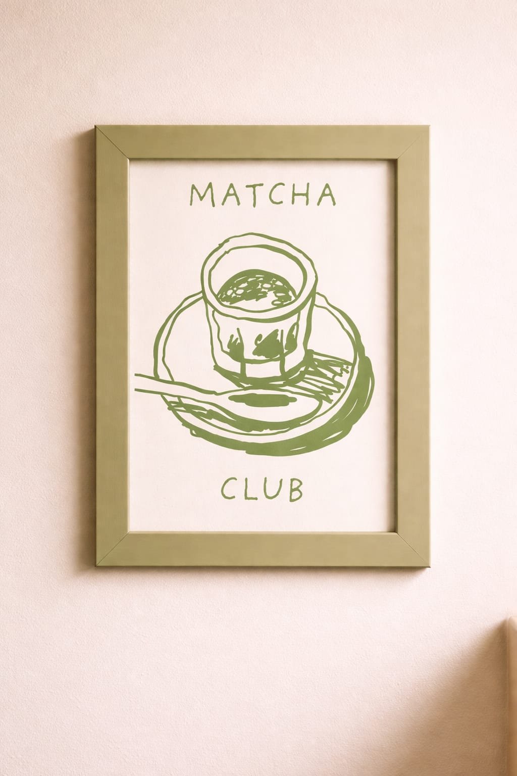 Welcome to the Matcha Club. Handwritten stil nežna zelena ilustracija šolje matcha čaja. ✦ Format: A4 ✦ Zeleni drveni ram uključen ✦ Savršena kombinacija sa Coffee Time posterom.