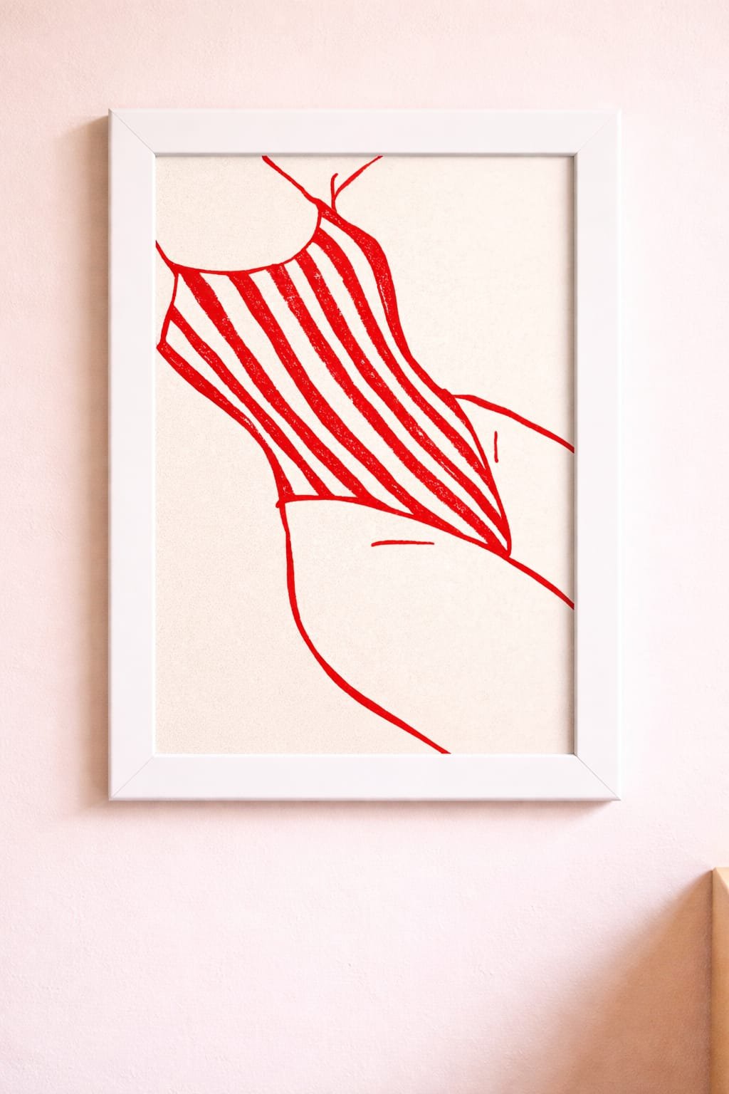 Čista linija. Čisto leto. Minimalistički poster u crveno-beloj boji sa ženskom figurom u elegantnom prugastom kupaćem. ✦ Format: A4 ✦ Beli drveni ram uključen ✦ Idealan za spavaću sobu ili kupatilo.